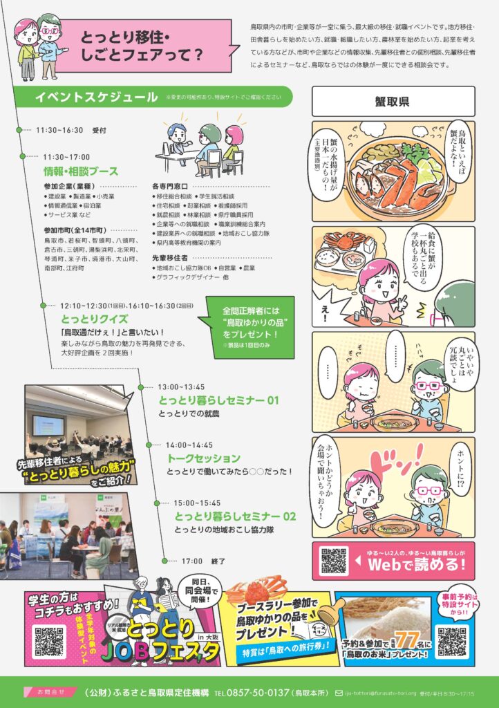 地方移住・田舎暮らしを始めたい方、就職・転職したい方、農林業を始めたい方、起業を考えている方などが市町や企業などの情報収集、先輩移住者との個別相談、先輩移住者によるセミナーなど、鳥取ならではの体験が一度にできる相談会です。